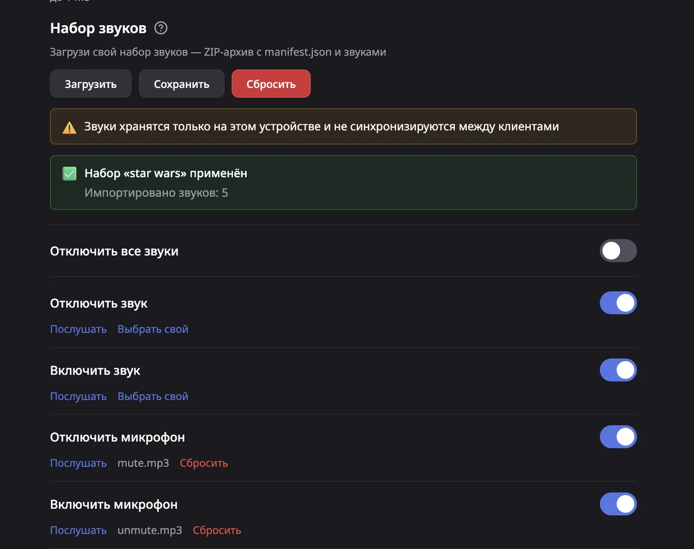 • Добавлена возможность выгрузки и загрузки zip-архива со звуками для удобного обмена